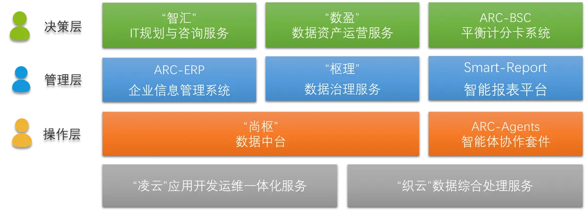 決策層,“智匯”IT規(guī)劃與咨詢服務(wù),憑借專業(yè)團隊對行業(yè)趨勢和技術(shù)生態(tài)的深度洞察,為企業(yè)量身定制契合發(fā)展戰(zhàn)略的IT架構(gòu)藍圖,明晰數(shù)字化路徑;“數(shù)盈”數(shù)據(jù)資產(chǎn)運營服務(wù),挖掘企業(yè)數(shù)據(jù)價值,將分散數(shù)據(jù)轉(zhuǎn)化為可運營、能創(chuàng)造效益的資產(chǎn),驅(qū)動業(yè)務(wù)創(chuàng)新;ARC - BSC平衡計分卡系統(tǒng),以戰(zhàn)略為導(dǎo)向,從財務(wù)、客戶、內(nèi)部流程、學(xué)習(xí)與成長等維度,量化指標、監(jiān)控進度,助力科學(xué)決策 。