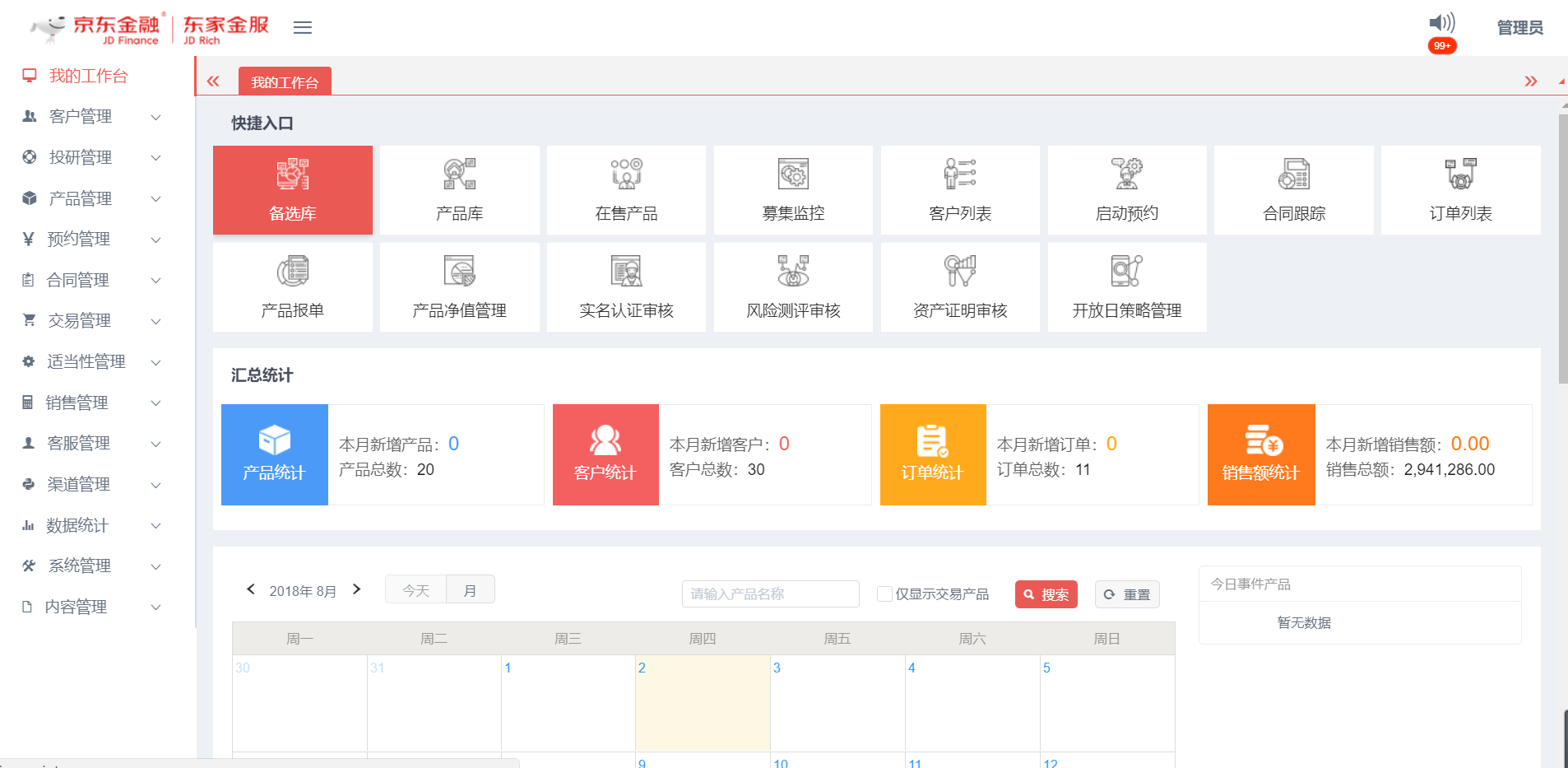 • 我的工作臺(tái):提供系統(tǒng)菜單快捷入口,統(tǒng)計(jì)核心業(yè)務(wù)數(shù)據(jù)及開(kāi)放期內(nèi)的產(chǎn)品日歷事件展示