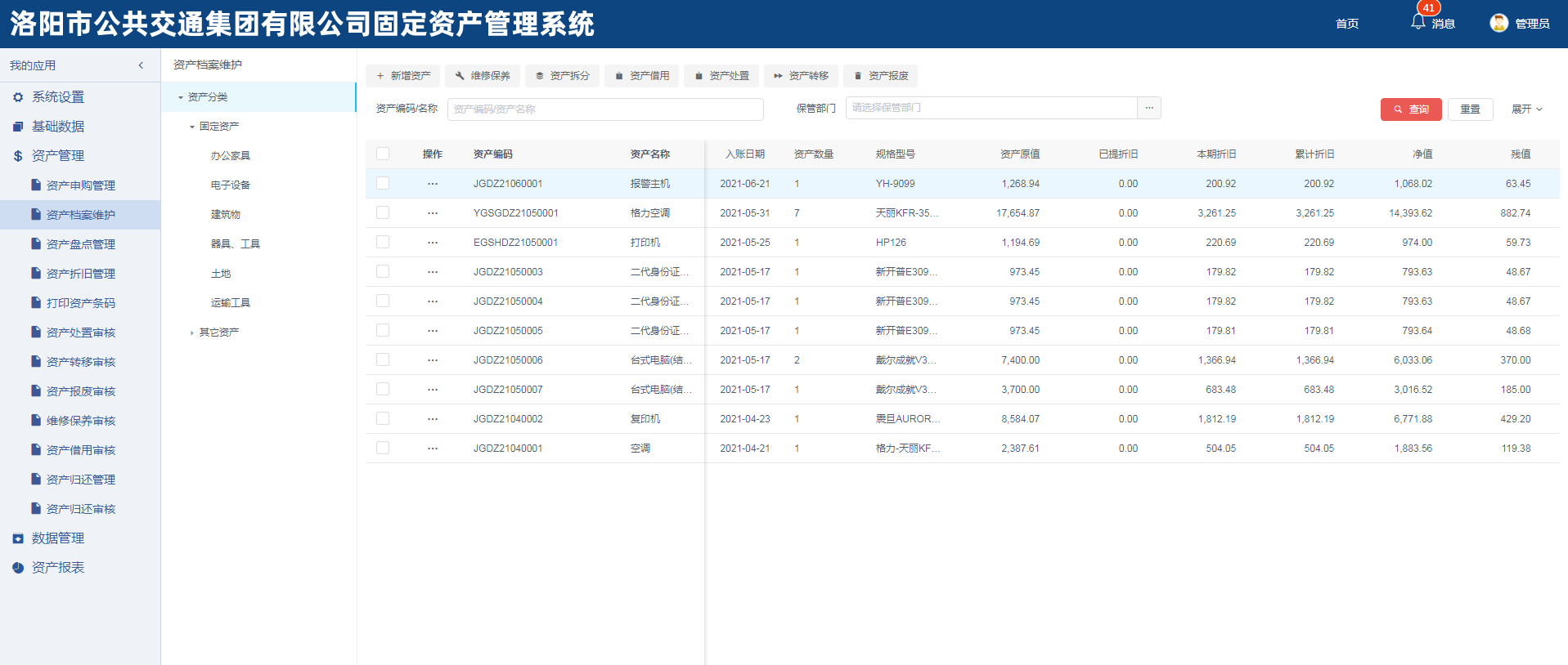 • 資產管理:資產申購管理(申請、審核)、資產檔案維護、借用/歸還、資產轉移、資產報廢、維修保養(yǎng)、續(xù)用、條碼打印、資產盤點管理、資產折舊、資產報廢管理(申請、審核)、資產處置(已報廢的資產)
